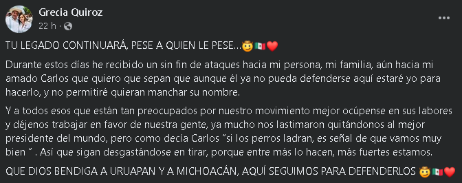 “Durante estos días he recibido un sin fin de ataques hacia mi persona, mi familia, aún hacia mi amado Carlos que quiero que sepan que aunque él ya no pueda defenderse aquí estaré yo para hacerlo, y no permitiré quieran manchar su nombre. Y a todos esos que están tan preocupados por nuestro movimiento mejor ocúpense en sus labores y déjenos trabajar en favor de nuestra gente, ya mucho nos lastimaron quitándonos al mejor presidente del mundo, pero como decía Carlos “si los perros ladran, es señal de que vamos muy bien”.