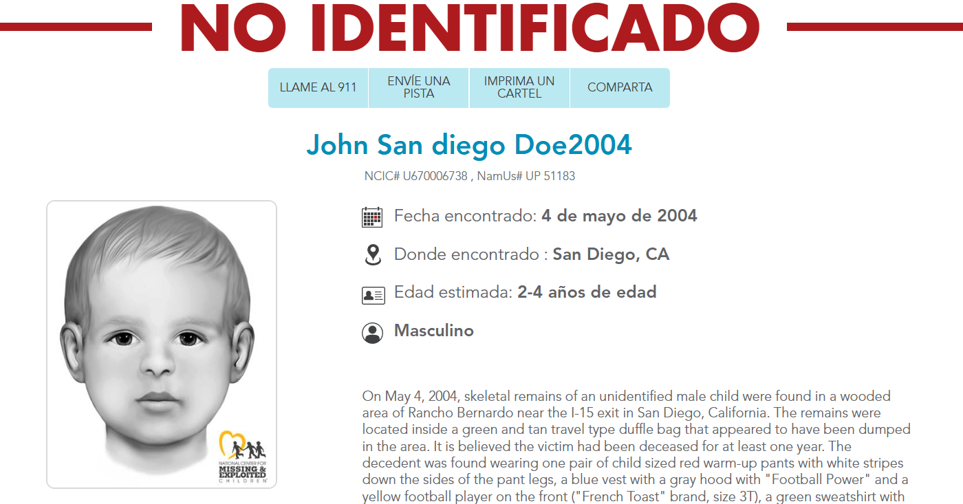 A pesar de los esfuerzos policiales y forenses, el niño (identificado en los archivos como “John San Diego Doe 2004”) nunca fue reportado como desaparecido, lo que dificultó cualquier intento de rastrear su identidad y origen.