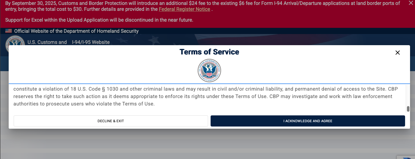 Recientemente el Gobierno de Estados Unidos implementó un nuevo cargo obligatorio de 24 dólares por la emisión del Formulario I-94, documento esencial para registrar la entrada y salida de extranjeros no inmigrantes en el país, el cual entrará en vigor el 30 de septiembre.
