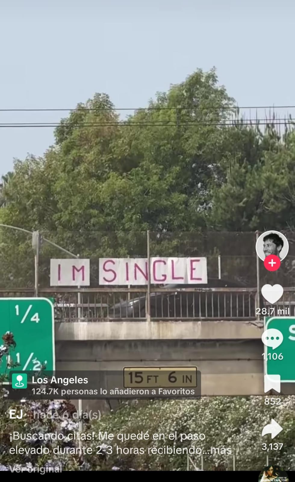 Un hombre en California llamado Eric Jonas se hizo viral al colocar un letrero con la oración “estoy soltero” en un freeway de Los Ángeles, acción que rápidamente comenzó a aumentar visualizaciones en TikTok.